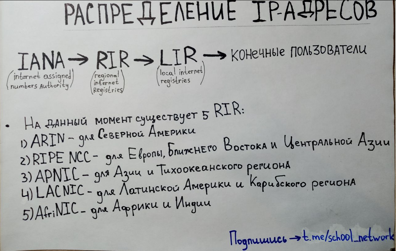 IANA - Internet Assigned Numbers Authority - самая главная организация, выдает ip адреса RIR - Regional Internet Registries (Региональные интернет-регистратор), который в свою очередь распределяет адреса LIR - Local Internet Registries (Локальный интернет регистратор), и уже он выдает их конечным абонентам.