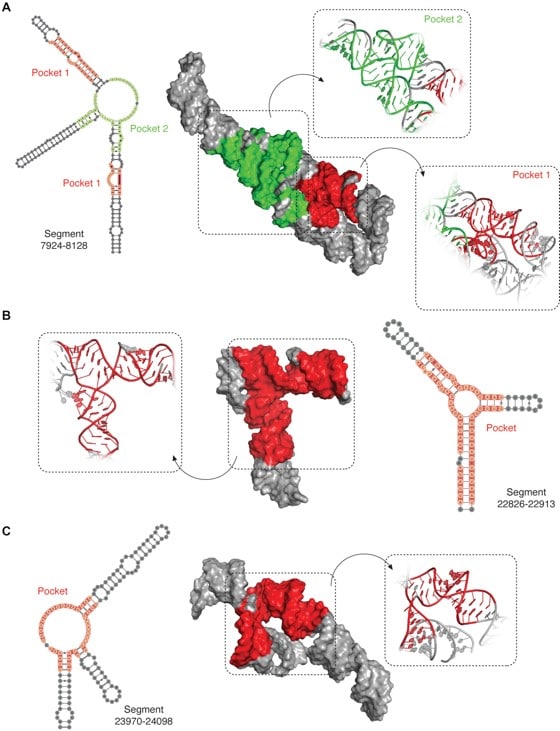 The researchers have modeled the three-dimensional structure of the regions with well-defined compact structure. The study presents one thousand best-scored models for each of the regions modeled, representing the conformational space with probable alternative 3D-configurations. Also, pockets were identified in the RNA structures that could be targeted by small molecules to hamper the function of the viral RNA.