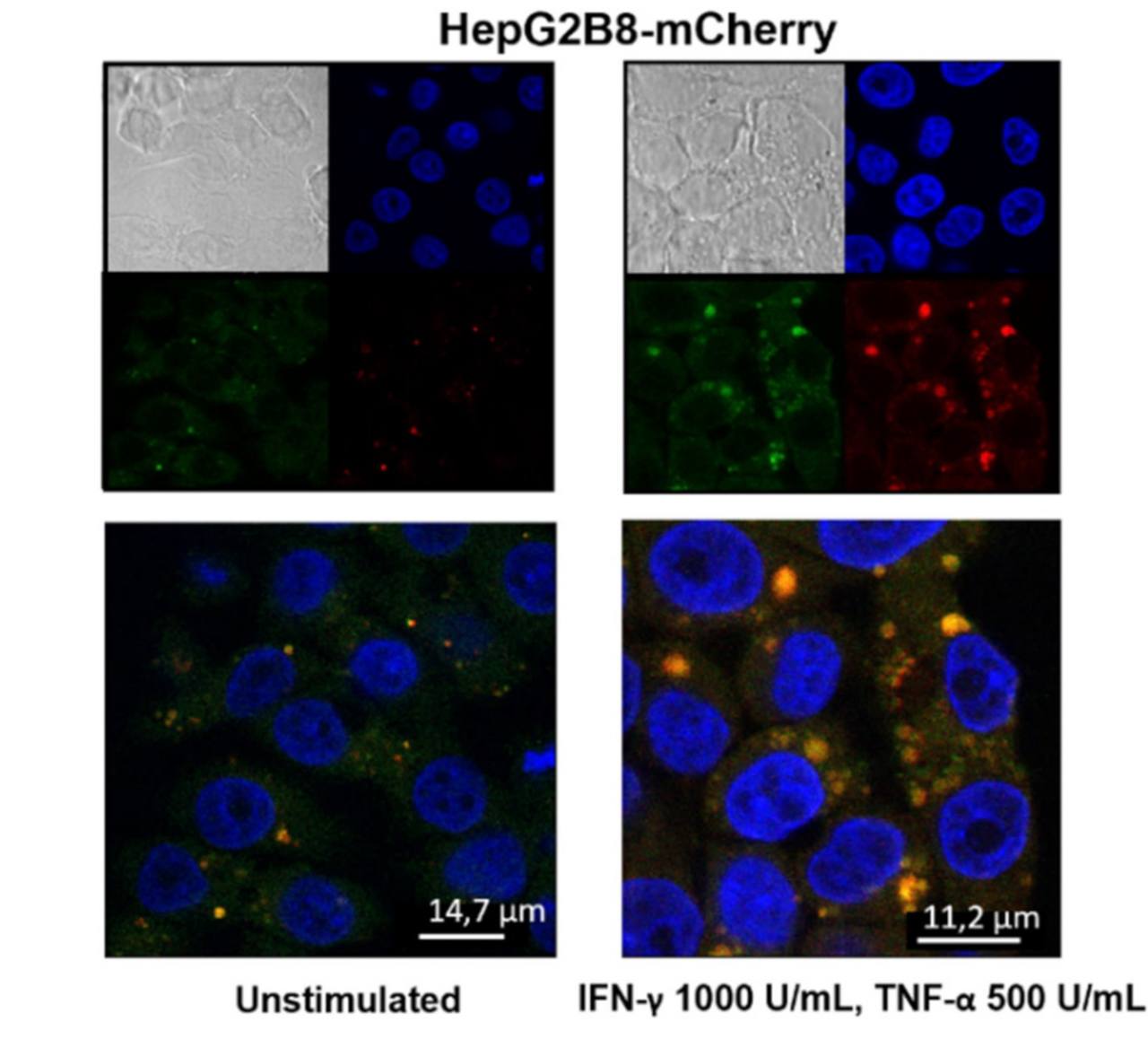 Показано увеличение экспрессии B5i (красным) и активности протеасом (зелёными) под действием интерферона и фактора некроза опухоли в клетках HepG2. Изображения получены с помощью конфокального микроскопа Leica.