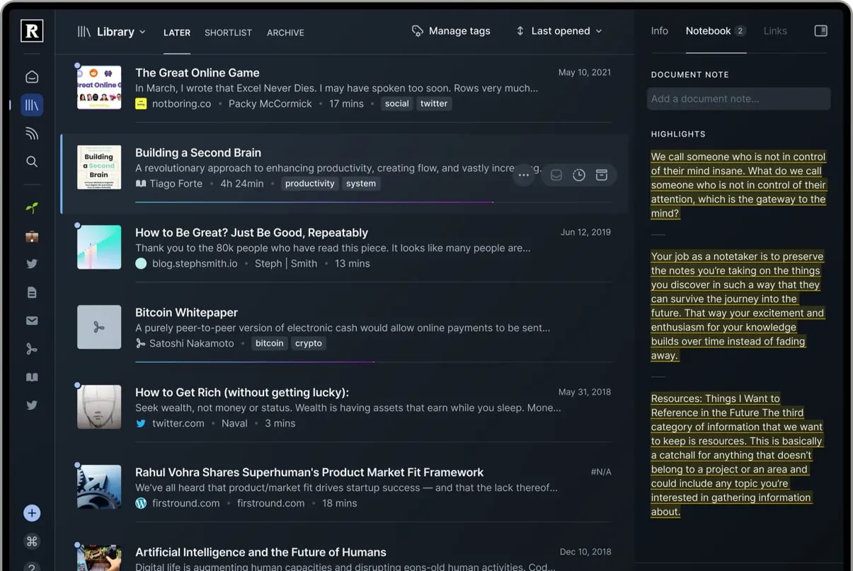 Записал небольшой обзор сервиса Reader от Readwise. По моему мнению - направление выбрано верное, методы реализации тоже радуют. Жду десктопные приложения и окончания периода бета-тестирования. Сервис - бомба, в перспективе заменит ютуб, читалки для книг, Pocket'ы. Instapaper'ы и другие подобные сервисы. Как говорится - рекомендую от души, есть же 😊 Второй сервис, после Obsidian Sync, за который я готов платить подписку, вот реально прям не жалко. Заслужили полностью.