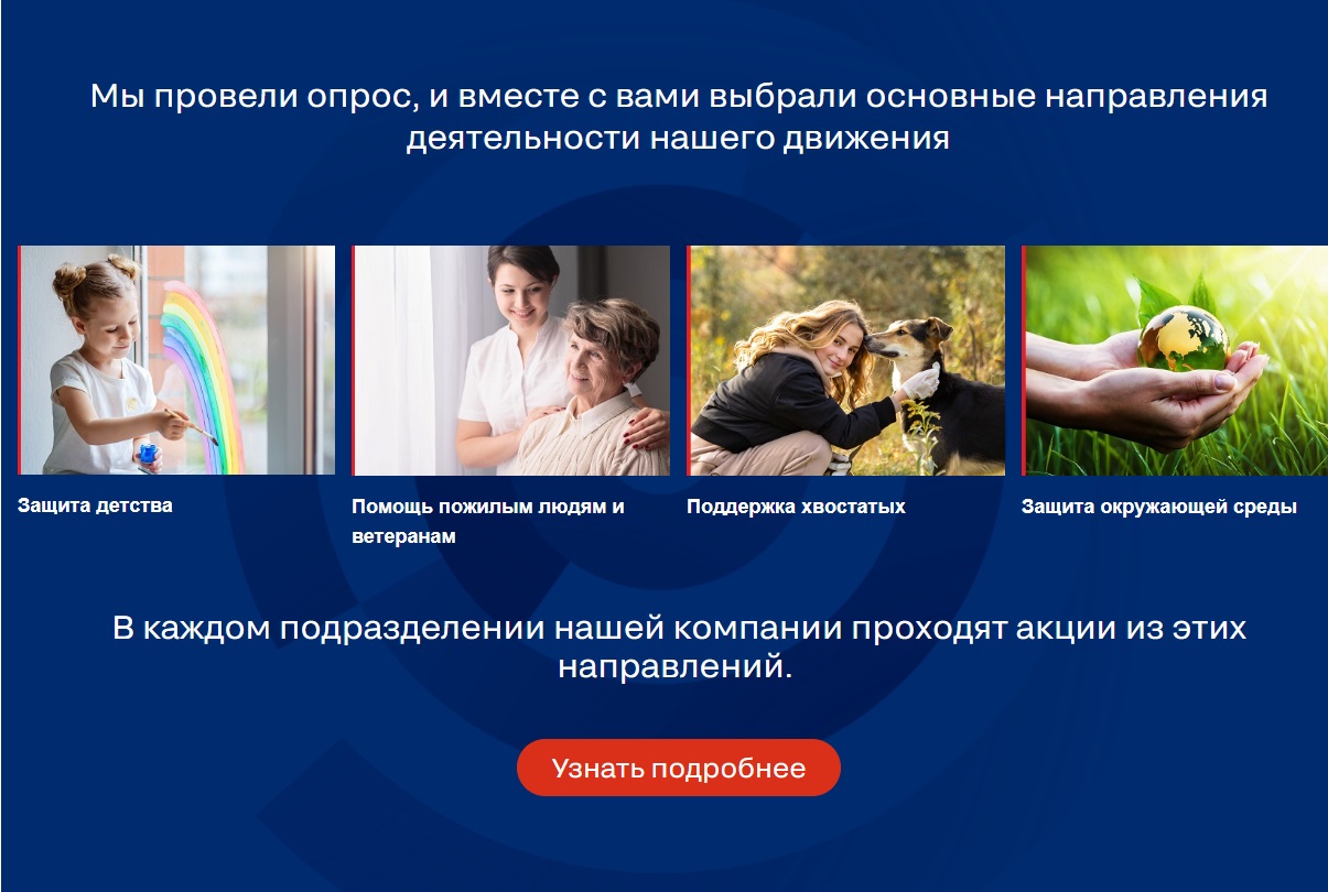 На внутреннем портале компании теперь запущен специальный раздел, который поможет каждому сотруднику быстро сориентироваться в активностях, анонсах и акциях компании в этом направлении, записаться волонтером.