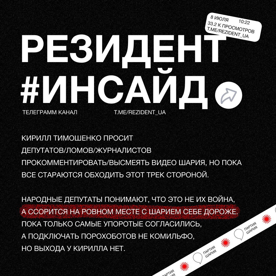 2. Кирилл Тимошенко взял на себя ответственность за информационное сопротивление нападкам на Зеленского. Он массово стал скупать ТG-каналы, которые достигли определенного количества подписчиков и использовать те самые темники против Шария, опубликованные неделей ранее. Из информационного меню на неделю: полить Шария грязью; опубликовать фейковые и устаревшие новости о нем; в очередной раз сделать отсылку к мифическому российскому финансированию. Интересно, долго ли Тимошенко протянет на такой скудной диете...