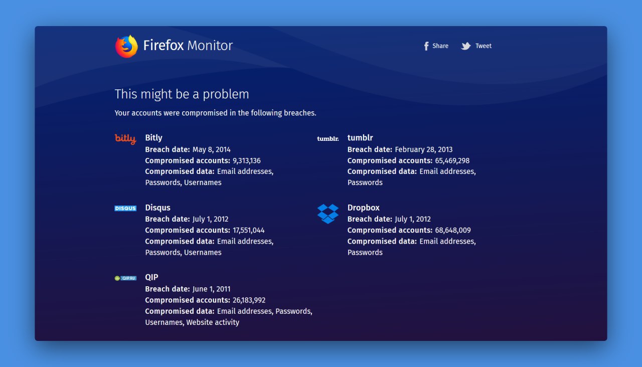 Mozilla представил сервис Firefox Monitor для проверки почтового ящика на предмет компрометации учетных данных аккаунта: логина, пароля, адреса почты. С помощью него можно проверить на каком интернет-сервисе вы были скомпрометированы! Постарайтесь вспомнить пароль, который использовали на скомпрометированном сайте и откажитесь от его использования вообще. Смените фразу для восстановления пароля и пользуйтесь менеджерами паролей, такими как 1Password, LastPass, или Dashlane для генерации сложных паролей. Где можно включить двухфакторную авторизацию — включайте. Не забудьте подписаться на рассылку Firefox Monitor, чтобы знать, какие ещё сайты подверглись атаке злоумышленников, и ваши персональные данные стали общедоступными.