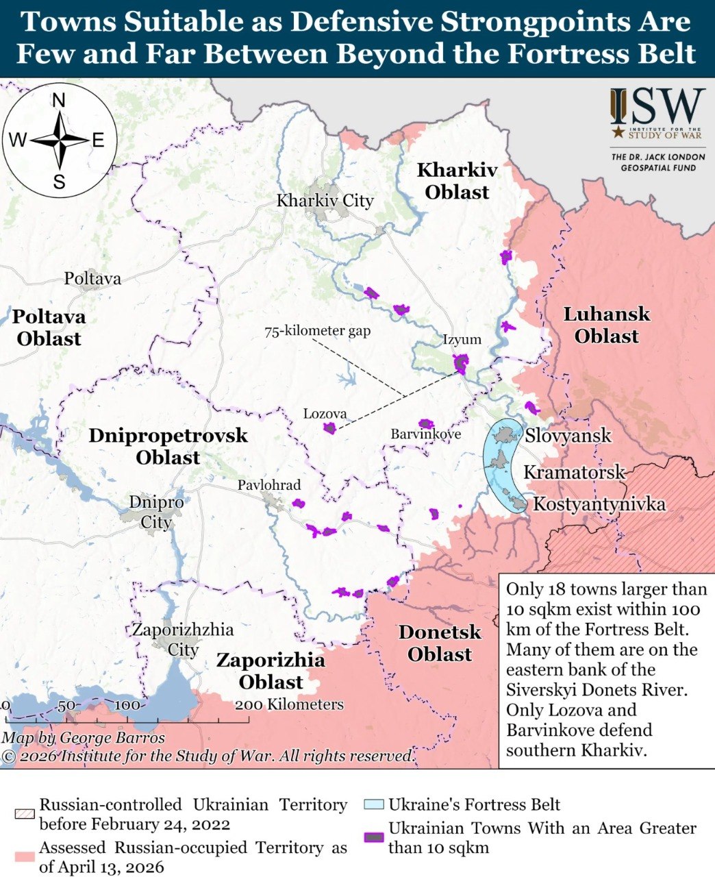 🔺19% Донецької області, що перебувають під контролем України, є критично важливими для оборони України. Це концентрація чотирьох великих міст Донецької області та їхніх супутніх поселень, що простягаються з півночі на південь вздовж шосе H-20 Костянтинівка-Слов'янськ. "Пояс" має довжину 50 кілометрів (приблизно відстань між Вашингтоном, округ Колумбія, і Балтимором, Меріленд)... до вторгнення населення становило понад 380 000 осіб. Україна протягом останніх 11 років вкладала час, гроші та зусилля у зміцнення Поясу фортець та створення значної оборонної інфраструктури в цих містах і навколо них.