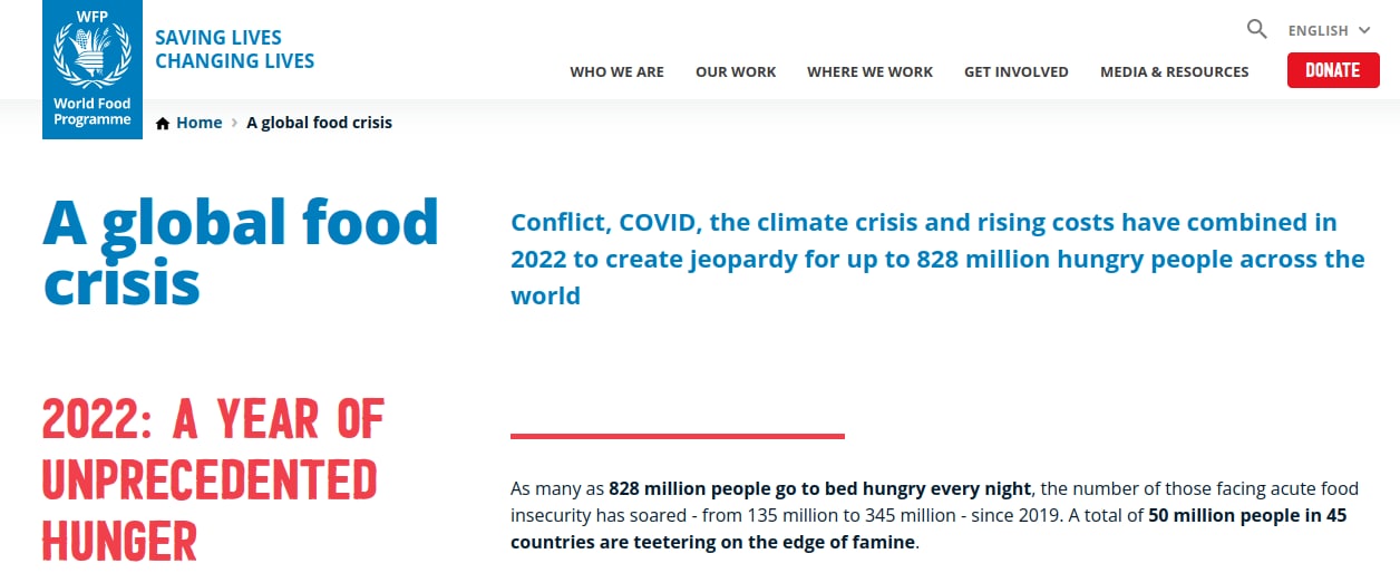 Отмечается, что количество соприкасающихся с острой нехваткой продовольствия резко возросло — со 135 млн в 2019 году до 345 млн — в 2022-м. 50 миллионов человек в 45 странах находятся на грани голода, а 828 миллионов человек в мире не имеют достаточного количества пищи и каждый вечер ложатся спать голодными.