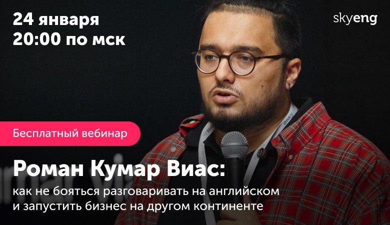 Основатель агентства Qmarketing и совладелец компании Qlean Роман Кумар Виас расскажет на бессплатном вебинаре, как преодолеть страх и начать использовать английский в бизнесе. Присоединяйтесь, чтобы перенять опыт Романа, зарядиться мотивацией и задать вопросы известному бизнесмену лично.