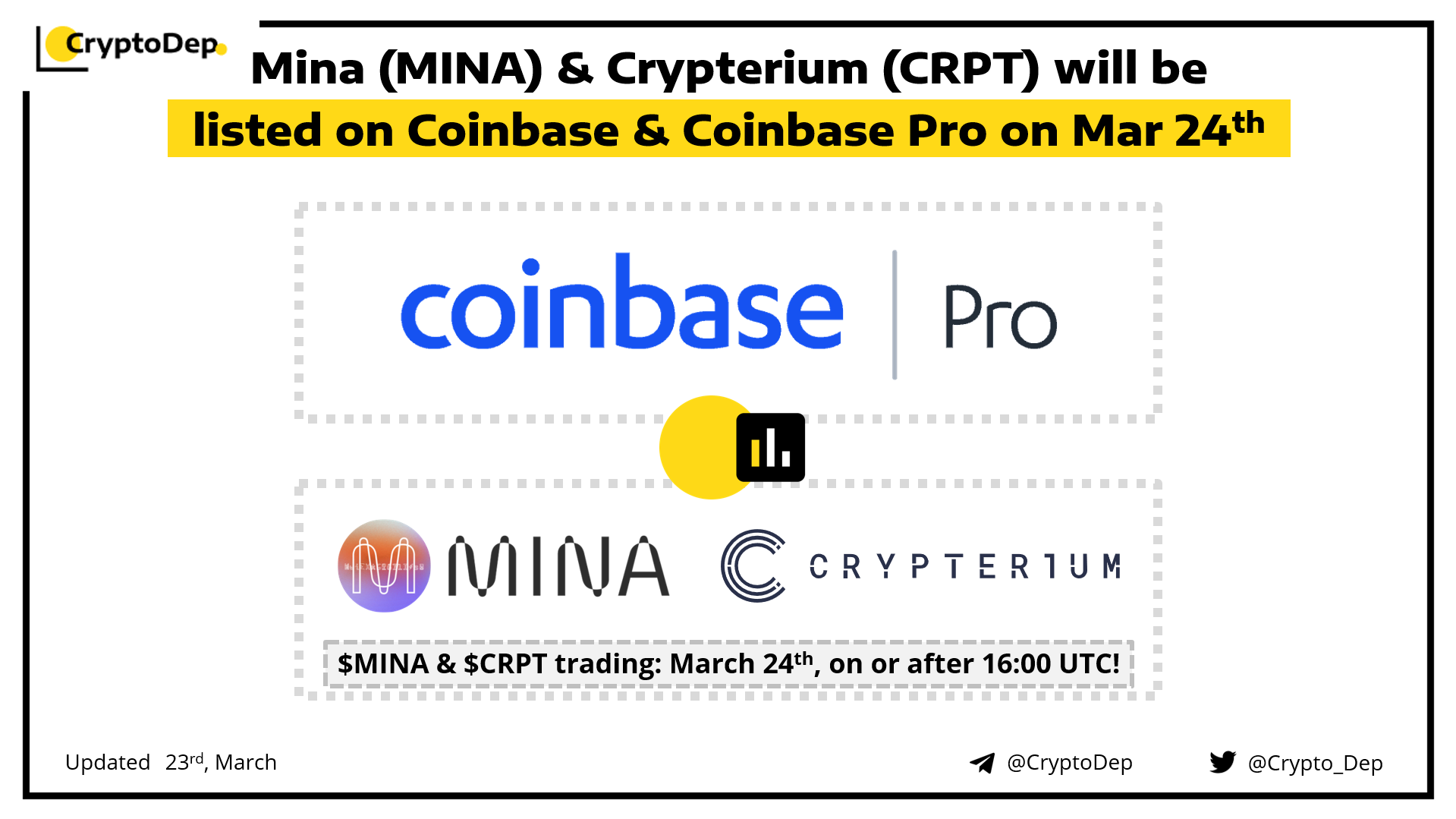 Trading for $MINA and $CRPT tokens will be available on Coinbase & Coinbase Pro on March 24th, on or after 16:00 UTC if liquidity conditions are met. Inbound transfers for this asset are now available.