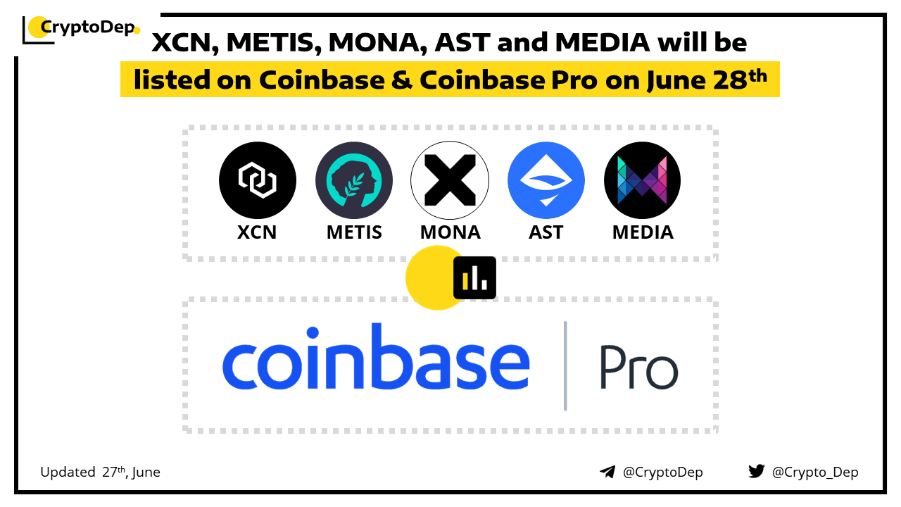 Chain (XCN), MetisDAO (METIS), Monavale (MONA), AirSwap (AST) and Media Network (MEDIA) will be listed on Coinbase & Coinbase Pro on June 28th