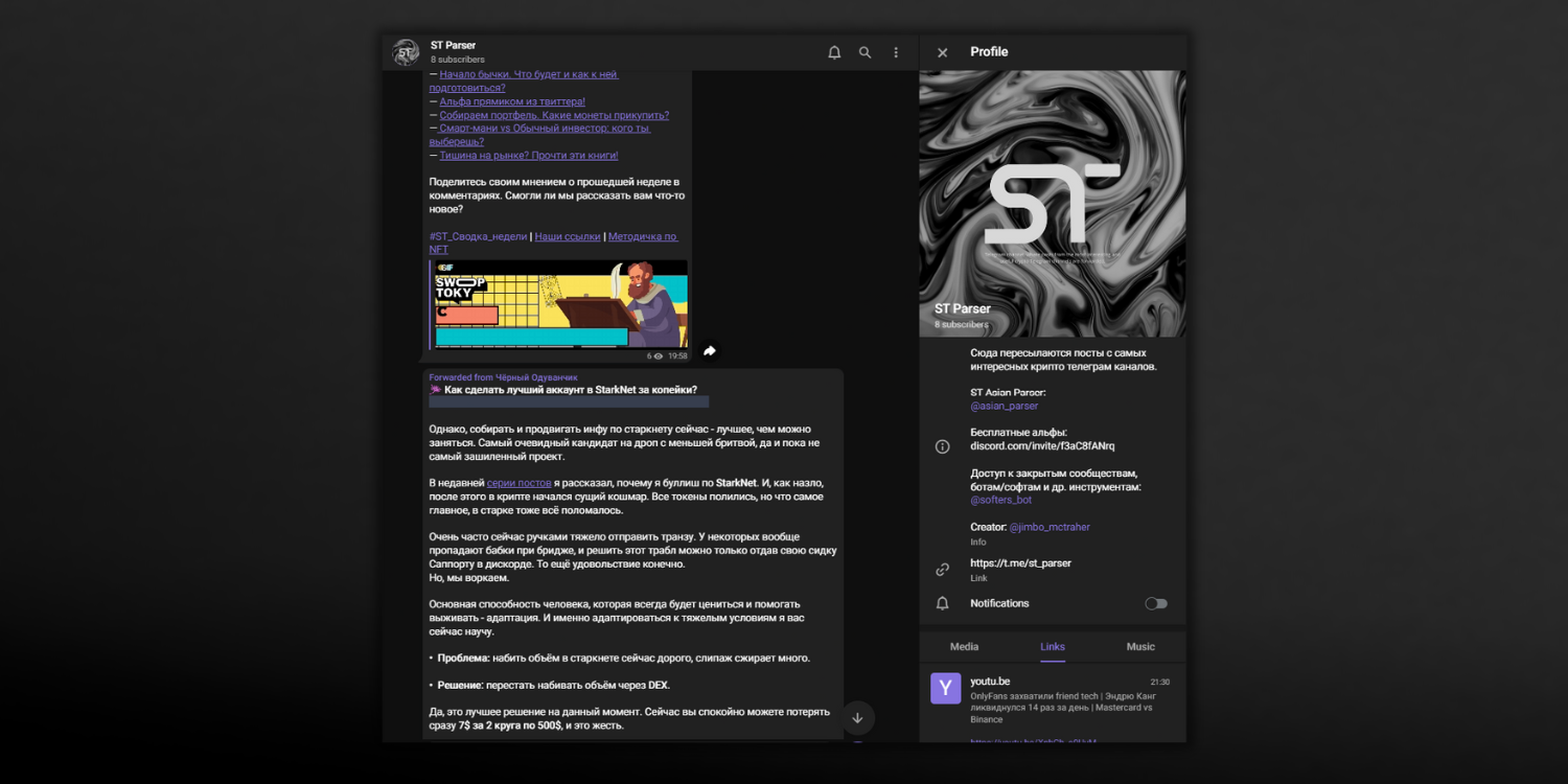 ST Parser — это открытый телеграм канал, куда пересылаются посты с самых интересных и полезных крипто телеграм каналов.