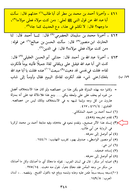 أخبرنی زکریا بن یحیى أن أبا طالب حدثهم أنه سأل أبا عبد الله عن قول النبی لعلی من کنت مولاه فعلی مولاه ما وجهه قال لا تکلم فی هذا دع الحدیث کما جاء/👈🏻اسناد هذا الاثر صحیح