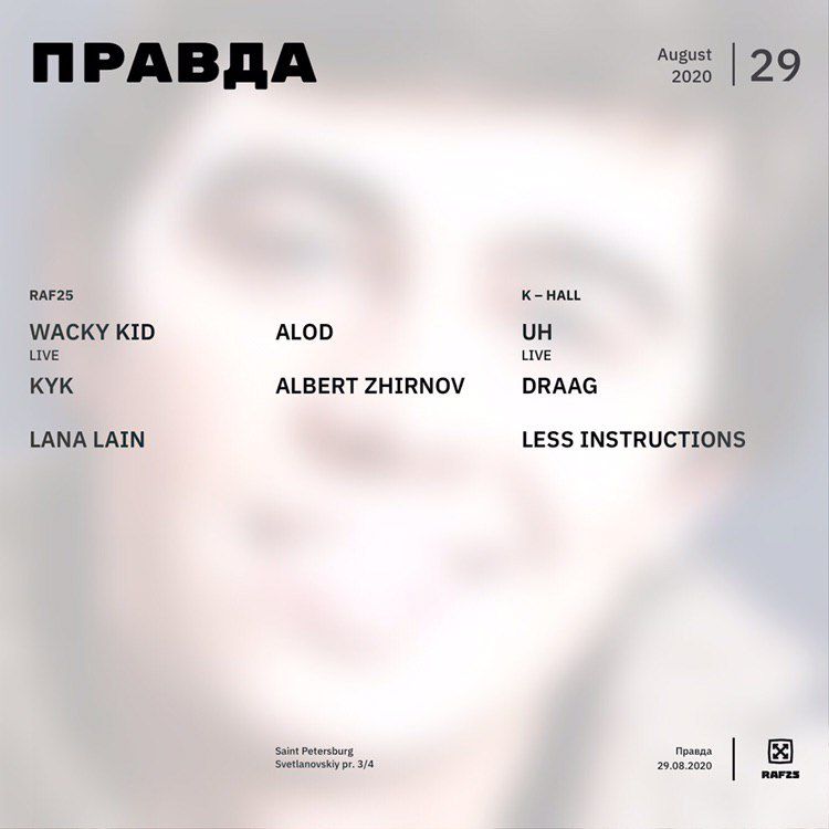 Правда за нами – RAF25 возвращается! А вместе с ним Wacky Kid, Draag, Kyk, Albert Zhirnov, Less Instructions, UH, ALOD и даже Lana Lain – в субботу 29 августа на двух танцполах.