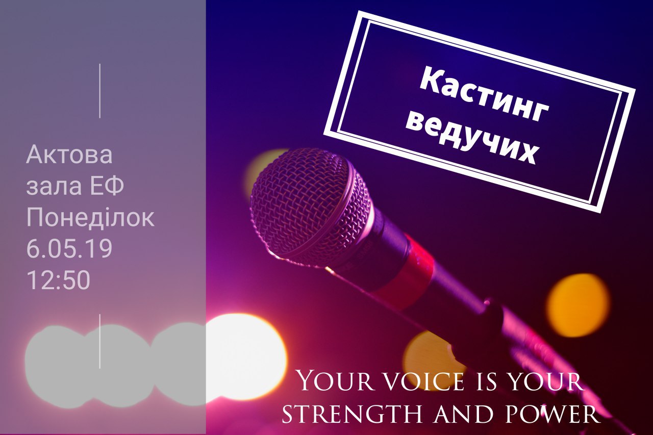 Приходь на кастинг ведучих у понеділок 6-го травня о 12:50 до актової зали економічного та випробуй свою вдачу стати зірковими ведучими концерту Дня ЕФ 👫✨🌟🎉