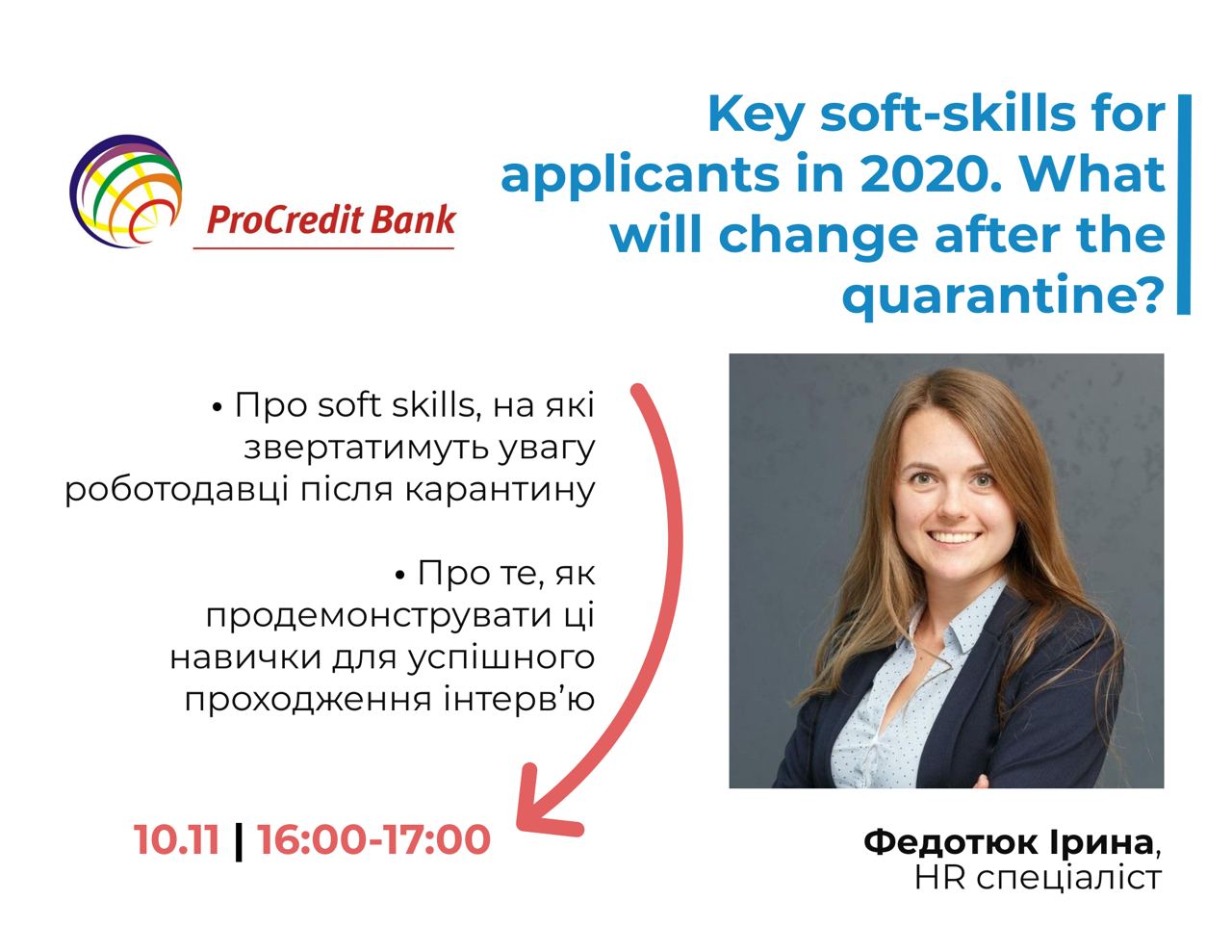 Тільки 🔟 листопада з 1️⃣6️⃣.0️⃣0️⃣ по 1️⃣7️⃣.0️⃣0️⃣ на тебе чекатиме вебінар із Федотюк Іриною - HR менеджеркою ProCredit Bank.