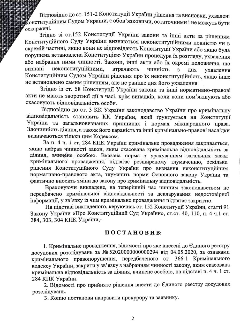 Копію постанови про закриття кримінального провадження у зв‘язку із тим самим рішенням Конституційного суду я отримав як заявник.