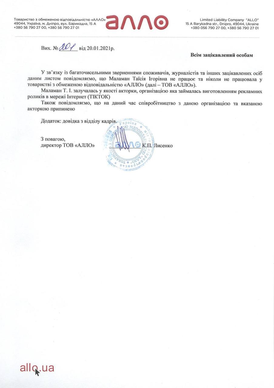 І тільки тоді Алло повідомила, що припиняє з Таісією співпрацю.