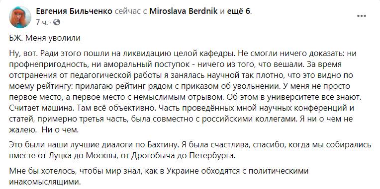 Українофобку Більченко, яка підтримує «ЛДНР», росію та називає агресію РФ «братньою війною» звільнили з університета Драгоманова, де вона працювала викладачем🎉