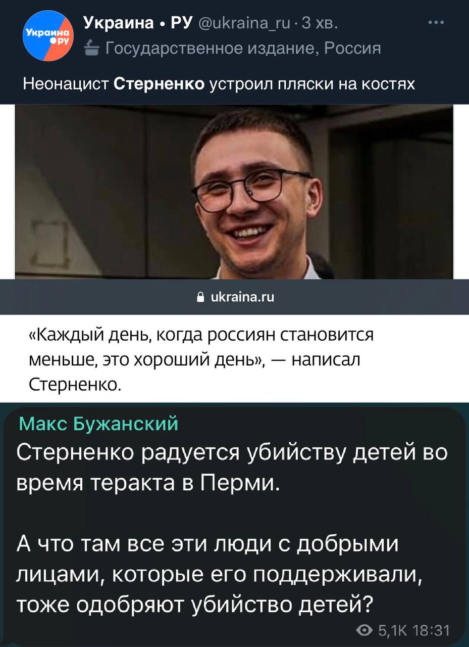 Нардеп Максім Бужанський вигадав собі що я нібито десь висловив радощі про терористичний акт в Пєрмі на росії і тепер він, ряд російських помийок та ціле медіа УНІАН мене рішуче засуджують та обурюються.