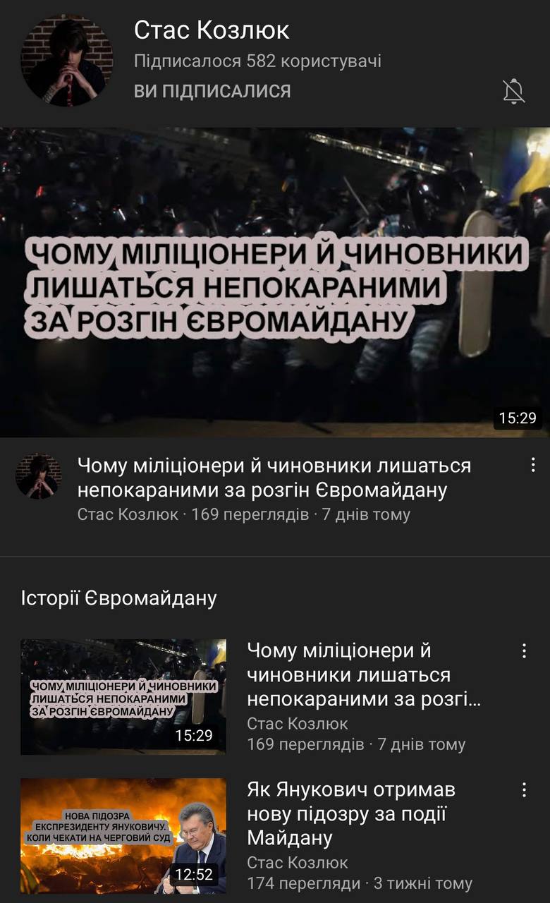 Друзі, тут журналіст Стас Козлюк веде дуже важливий ютуб-канал про те, що зараз відбувається по справам Майдану — розповідає як мусора видавали тітушкам зброю, як їх зараз відмазують та багато іншого.