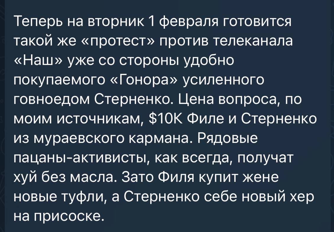 Друзі, оскільки на заяву Великої Британії щодо агента РФ Мураєва наша влада не реагує, а санкцій проти телеканалу НАШ і досі нема, є думка вийти на протест в Києві.