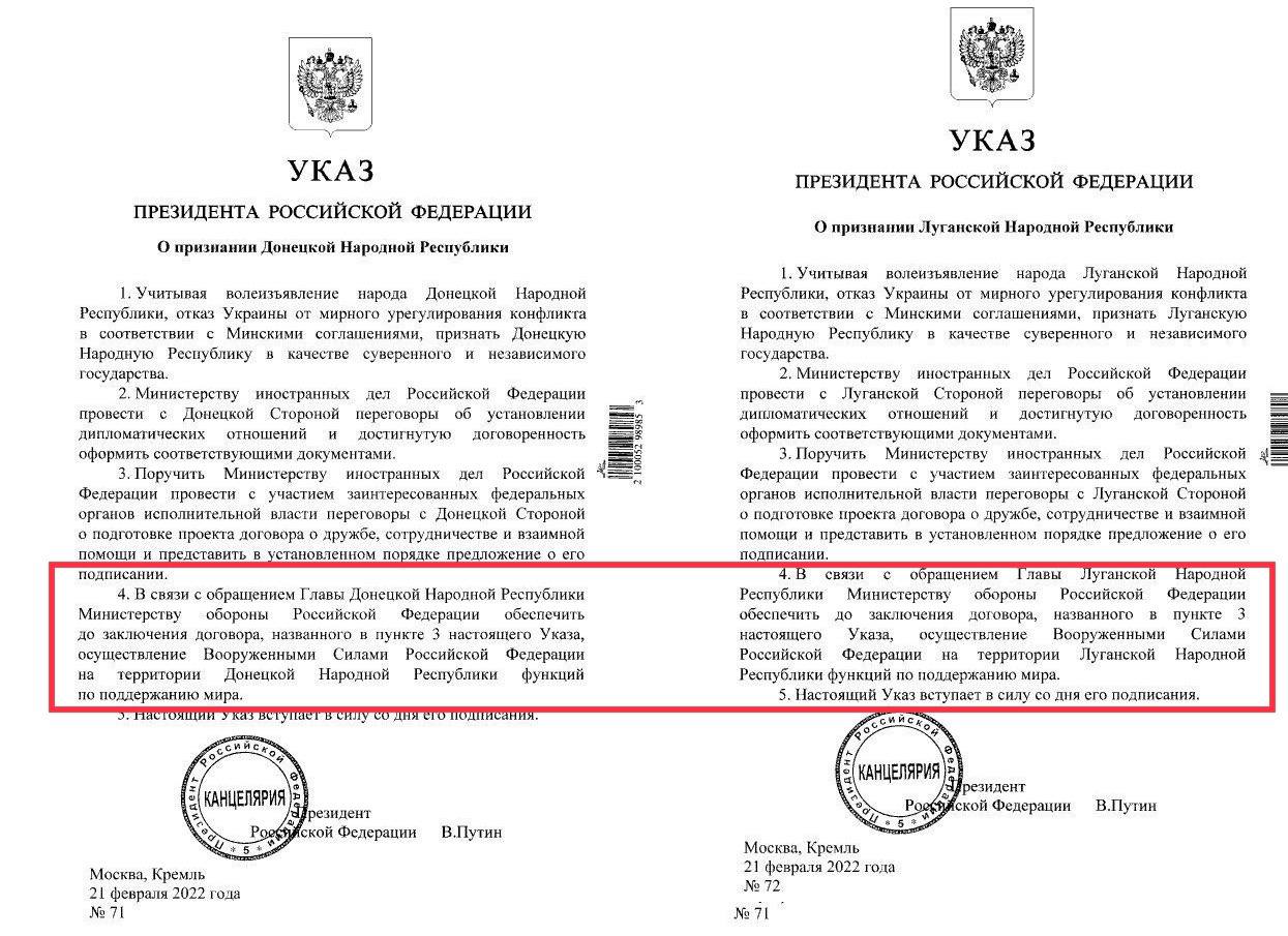 Згідно із новими указами путіна російська федерація вводить негайно свої війська (на додачу до вже там присутніх) на окуповані території України в Донецькій та Луганській областях.