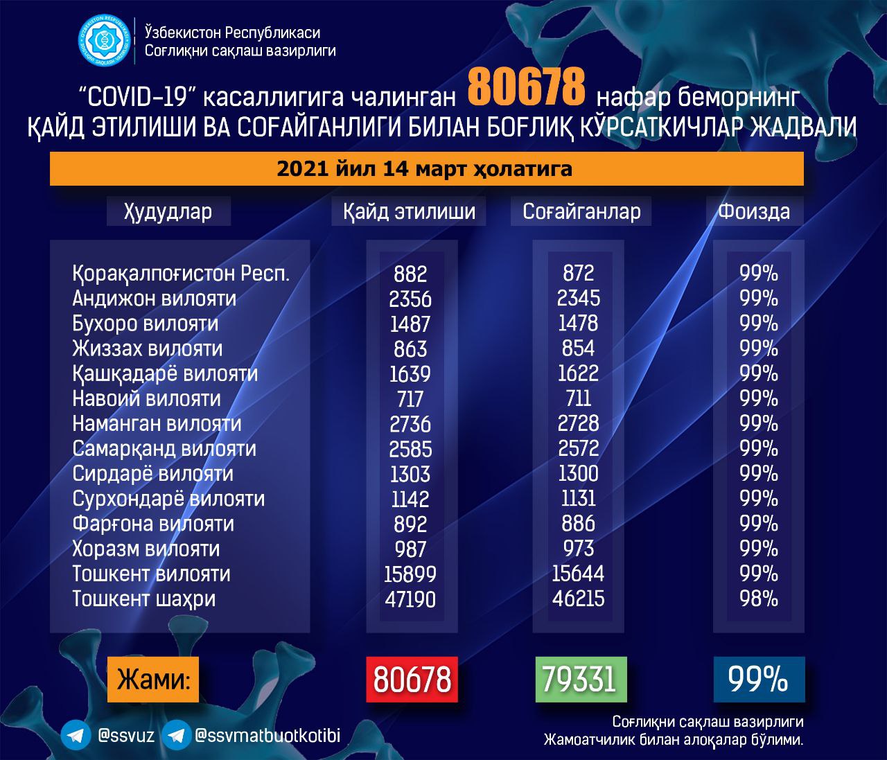 🔺2021 йил 14 март ҳолатига кўра, Ўзбекистонда коронавирус инфекцияси қайд этилганлар сони 80678 (+111) нафарни ташкил этмоқда.