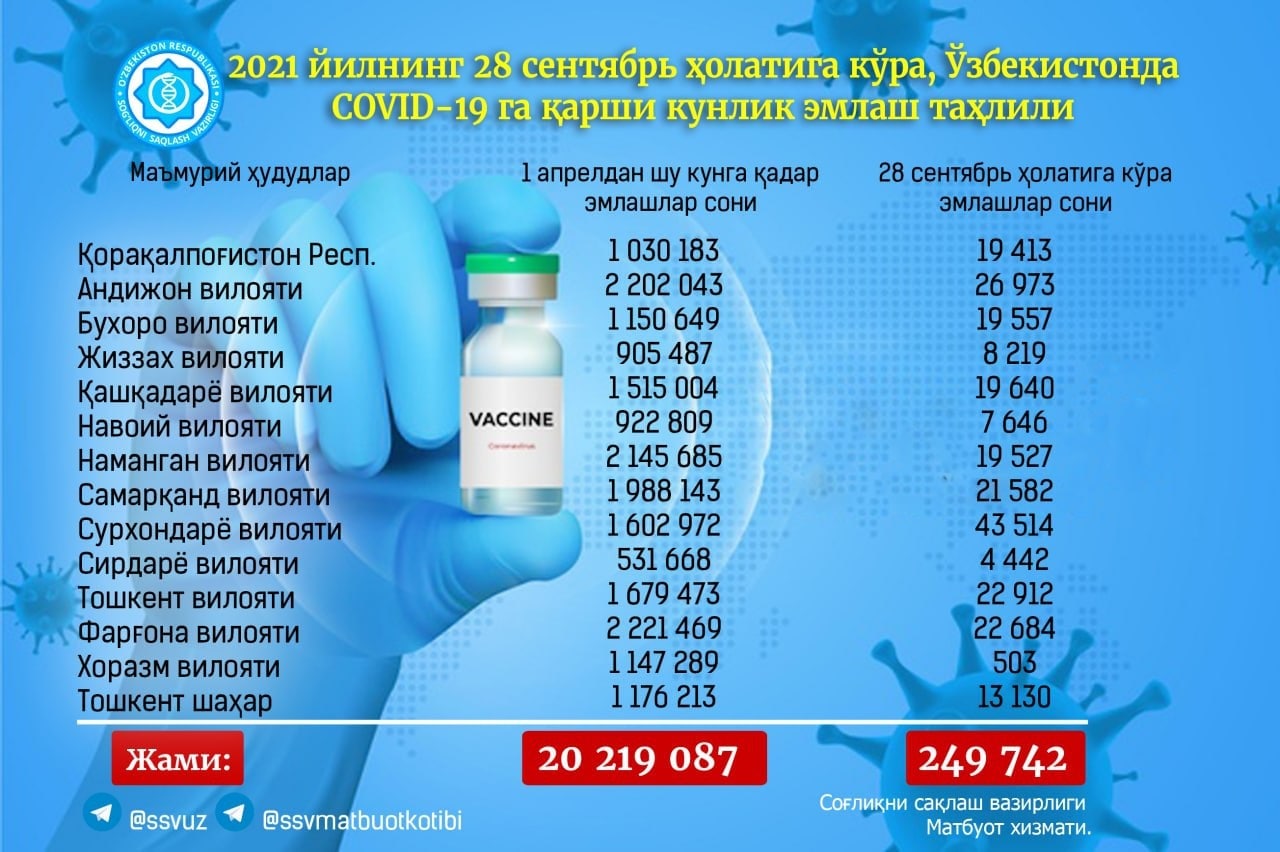 🔺28 сентябрда мамлакатимиз ҳудудлари бўйлаб 249 742 доза COVID-19га қарши вакцина қўлланилди. Улардан: