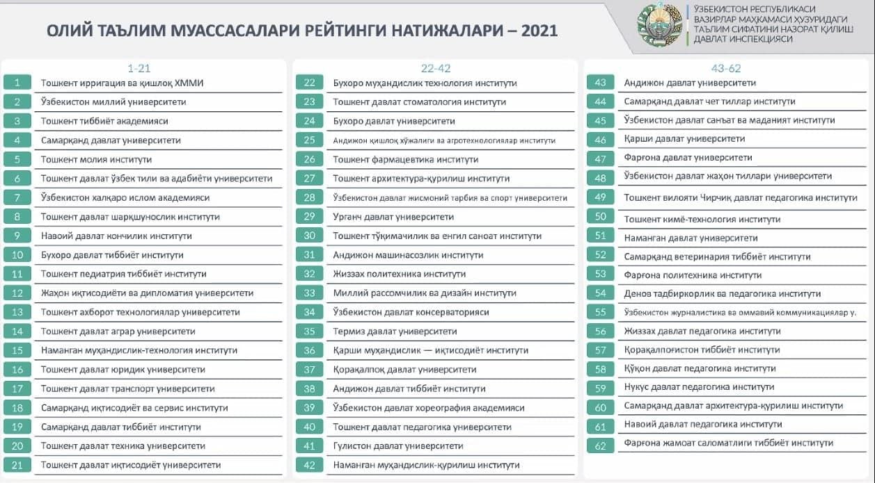 Ўзбекистон Республикаси Вазирлар Маҳкамаси ҳузуридаги Таълим сифатини назорат қилиш давлат инспекцияси томонидан юртимиздаги олий таълим муассасалари миллий рейтинги эълон қилинди.