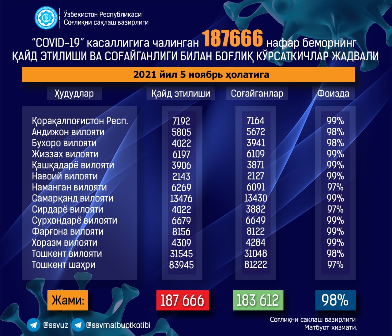 🔺2021 йил 5 ноябрь ҳолатига кўра, Ўзбекистонда коронавирус инфекцияси қайд этилганлар сони 187666 (+285) нафарни ташкил этмоқда.
