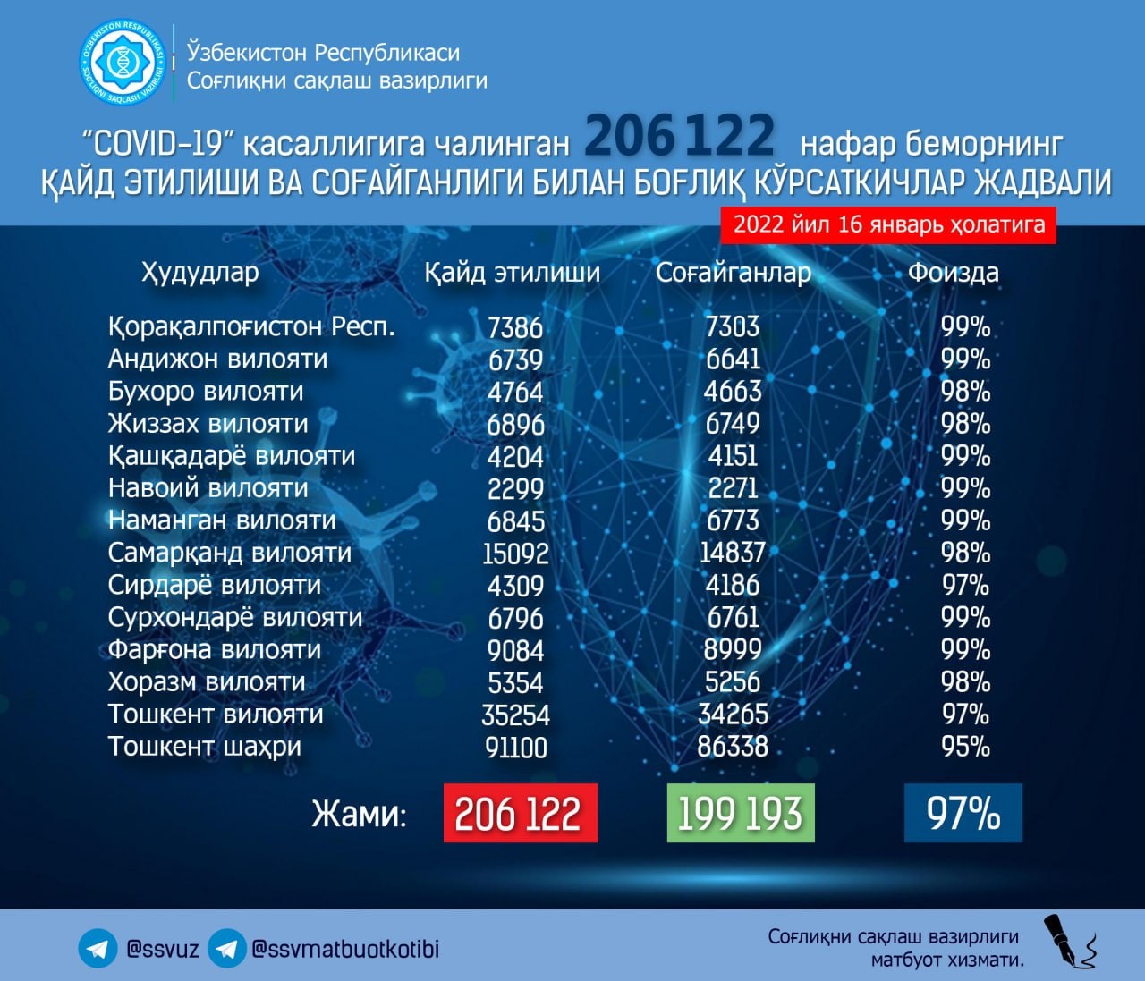 🔺2022 йил 16 январь ҳолатига кўра, Ўзбекистонда коронавирус инфекцияси қайд этилганлар сони 206122 (+1037) нафарни ташкил этмоқда.