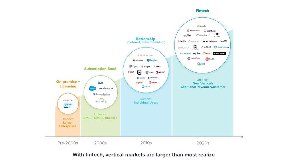 (2) В исследовании известного фонда a16z утверждается, что добавление финансовых услуг позволяет вертикальному (нишевому, тематическому) сервису увеличить выручку на пользователя в 2–5 раз. Но это ведь еще и меняет структуру продуктовой экономики — что позволит теперь создать успешные сервисы в тех нишах, где раньше это было невозможно. См. картинку - как менялись интересы инвесторов по моделям роста...
