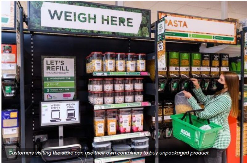 Новый магазин на заправке Asda находится в Шотландии. Предлагая широкий ассортимент товаров весового (макароны, крупы...) формата, магазин позволяет покупателям наполнять свои контейнеры, активно стремясь сократить количество пластиковых отходов в бакалейной промышленности. Кроме того, покупатели могут купить в магазине многоразовые контейнеры с той же целью. Супермаркет сотрудничал с рядом самых популярных брендов Великобритании, таких как Kellogg's, Yorkshire Tea, Unilever и Napolina, чтобы предоставить широкий ассортимент неупакованных товаров.