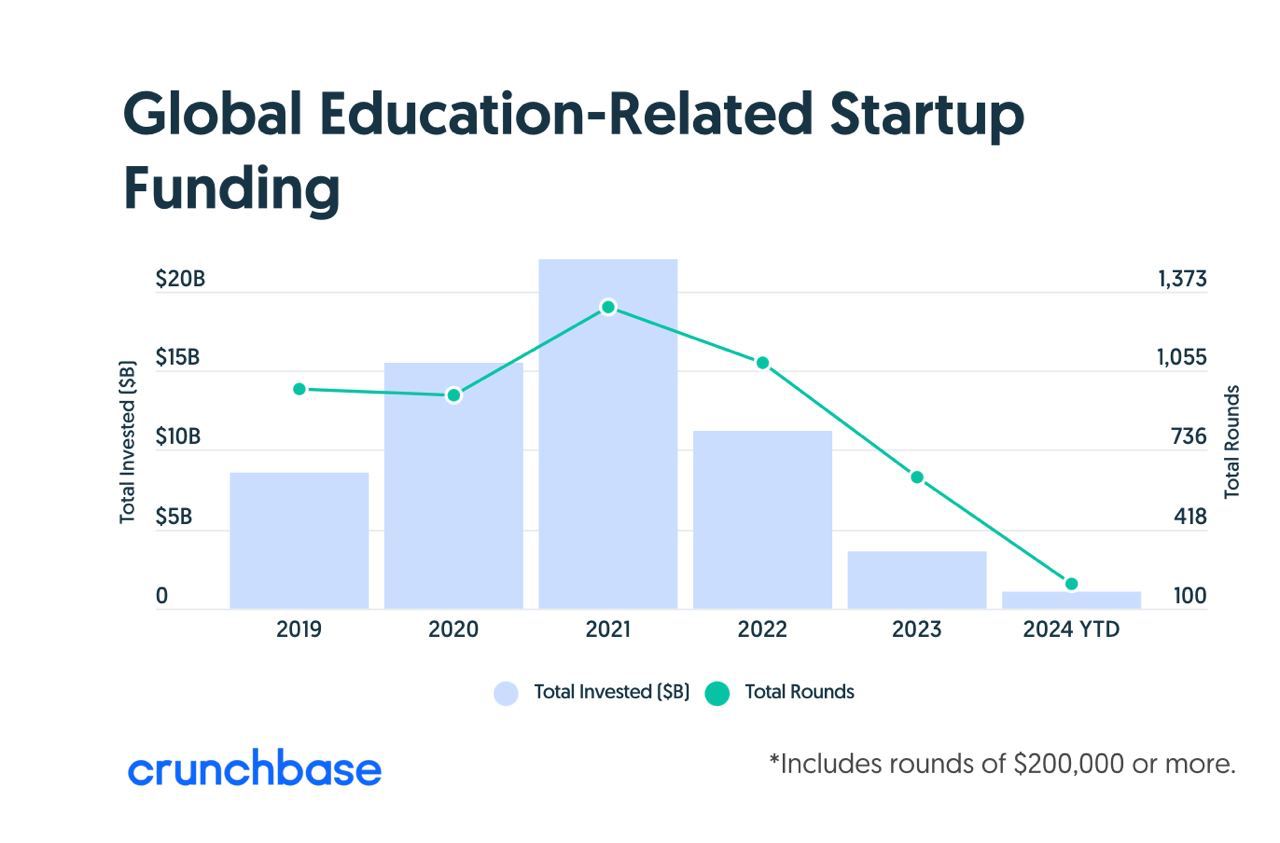 Crunchbase это не артикулирует, но кто-то явно… недоговаривает относительно того, есть ли вообще адекватный рынок под это. По прогнозам Morgan Stanley, мировые расходы на edtech вырастут с $250 млрд в 2022 году до $620 млрд в 2030 году.