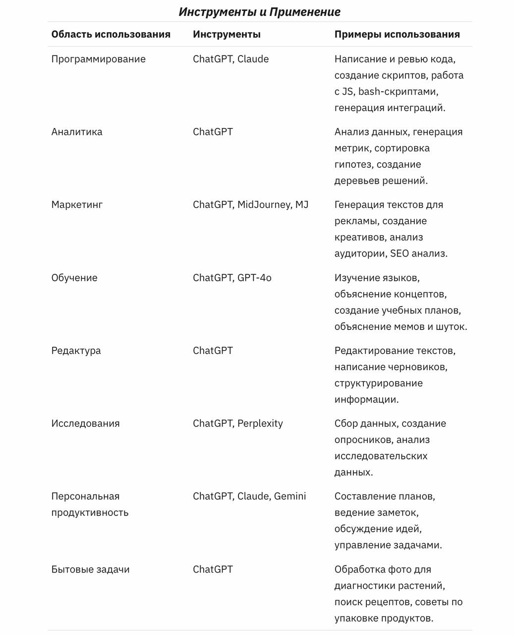 1 Широкий спектр применения: ИИ активно используется в разных сферах, от программирования и маркетинга до личной продуктивности и бытовых задач.