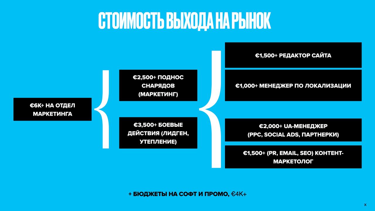 Стоит уже создавать систему маркетинга и продаж - и тогда она будет уже стоить около 6 тыс долл на страну - з/п персонала разговаривающего на языке рынка и уже имеющего хороший опыт продаж в выбраной стране и в выбранной нише. Потребуются еще затраты на таргетинг, маркетинг и продвижение - но это вам уже сформулируют нанятые специалисты в команде. Научитесь только правильно контролировать эти расходы и их эффективность.