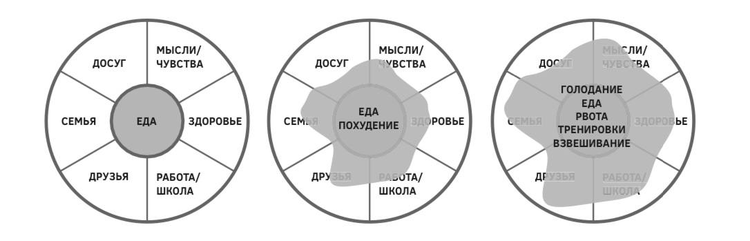 Партнеры, супруги и друзья оказываются в любовном треугольнике, где один из участников — пищевое расстройство. Довольно часто можно услышать от женщин с РПП, что муж принимает и даже боготворит их внешность, но они все равно одержимы идеей похудения. Так происходит, потому что РПП «крадет» человека из реальности, что наглядно видно на прикрепленной картинке. Иногда любовь, принятие и даже популярность не могут перевесить голос расстройства, упорно внушающего, что нужно худеть или менять тело еще.