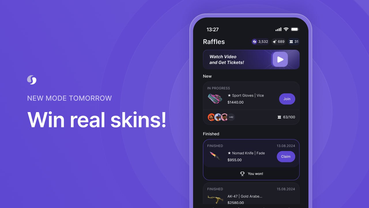๐ Over 600 real skins have already been won in Raffles. Don't miss your chance โ keep collecting tickets and participating in Raffles!