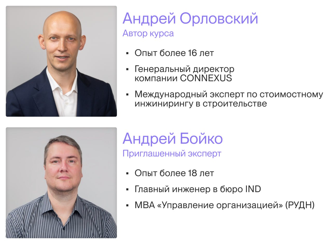 Автор курса — Андрей Орловский — генеральный директор компании CONNEXUS, эксперт по стоимостному инжинирингу в строительстве. Опыт работы 16+ лет в области строительства и управления инвестиционными проектами. Член правления RICS (Королевское общество сертифицированных специалистов в области недвижимости, Великобритания), участник экспертного совета Клуба Строителей Сколково.