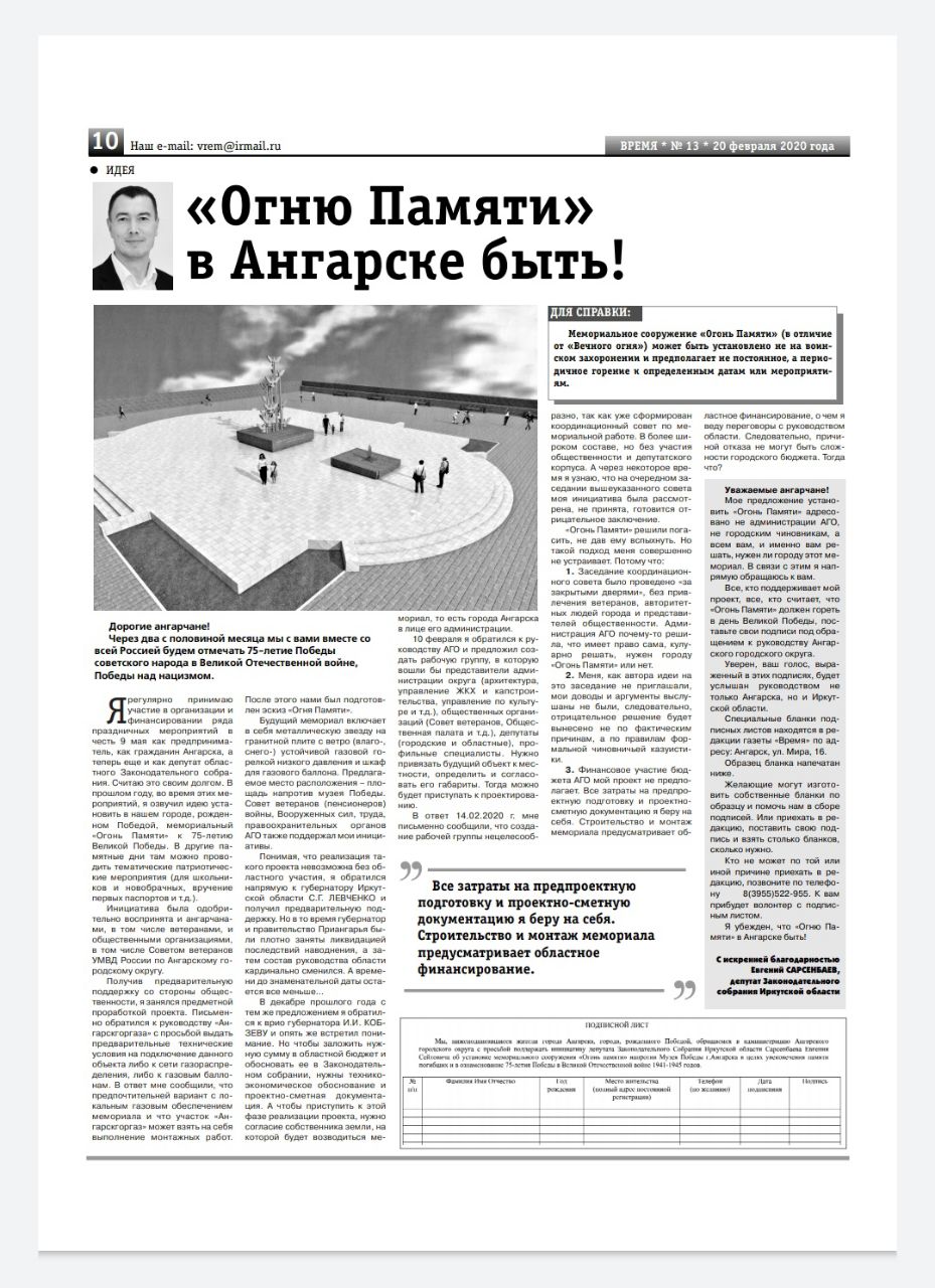 Намечаются серьёзные проблемы у мэра Ангарска Сергея Петрова. Вчера в ангарской газете "Время" вышел материал депутата законодательного собрания Иркутской области об отказе администрации АГО согласовать Огонь Памяти. Евгений Сарсенбаев ещё год назад предложил сделать в Ангарске Огонь Памяти, напротив музея Победы перед композицией "Голуби Мира". Сарсенбаев за свой счёт разработал эскизный проект и внёс его на рассмотрение администрации АГО для согласования места размещения объекта, так как земля у мемориала находится в собственности муниципалитета. Но тут Петров совершил непростительную для любого мэра ошибку: в год 75-летия Победы, он решил поиграть отказать ангарчанам в Огне Памяти только на том основании, что инициатором идеи выступил его возможный противник на предстоящих в сентябре выборах мэра, невзирая на то, что эта идея уже была озвучена на самом высоком уровне и получила предварительное одобрение. Думается, что Петрову будет трудно объясняться с Кобзевым по поводу очевидного противопоставления личных (шкурных) политических интересов над государственными задачами.