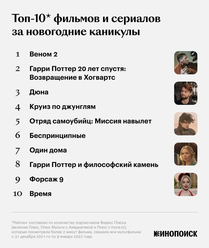 Единственным сериалом в топ-10 за праздники оказались «Беспринципные» — их смотрели больше, чем всё тот же «Один дома» и «Гарри Поттер и философский камень». Полный рейтинг — на картинке в посте, считался он по количеству подписчиков Плюса (включая расширенные подписки), смотревших более 2 минут контента с 31 декабря по 9 января включительно. Полный материал доступен по ссылке.