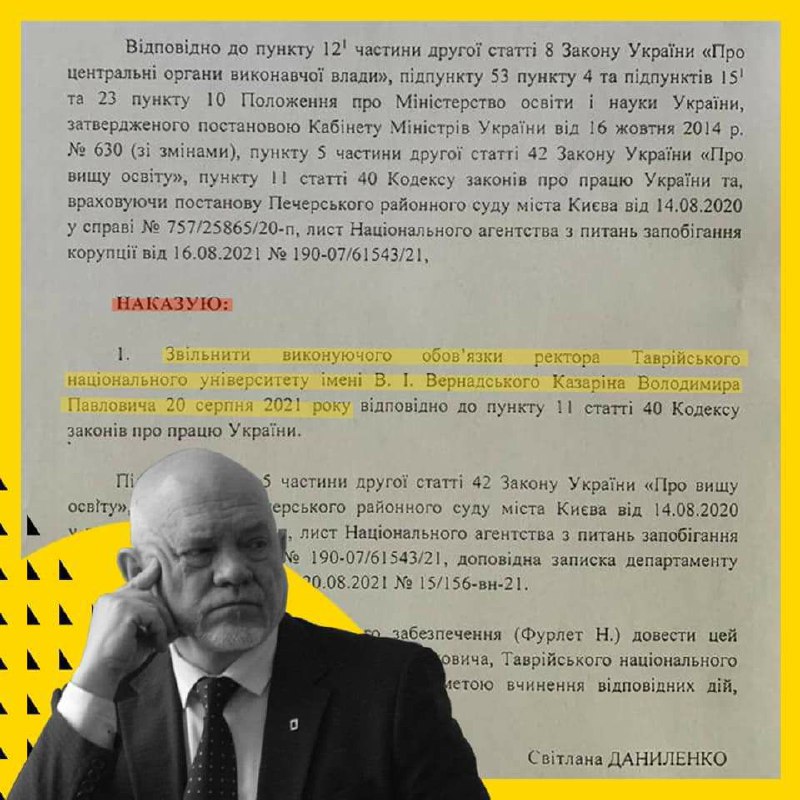 🏢 Таврійский Національний Університет імені В.І. Вернадського перемістили з Криму до столиці у 2016 році. Метою закладу було дати студентам з півострова якісну українську освіту. Проте з цим не склалося, бо Казарін почав знищувати університет, а не відбудовувати його. Викладачі вишу неодноразово заявляли про корупцію з боку керівництва, «мертві душі», які начебто навчалися в університеті і чия стипендія привласнювалася керівництвом. Протягом кількох років МОН ніяк не реагувало на ці звинувачення 🤦🏻♂️