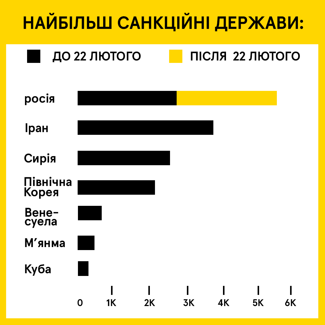 «Всього за два тижні повномасштабного вторгнення в Україну росія обійшла Іран і Північну Корею, щоб стати найбільш санкційною державою у світі», — пише «Bloomberg». Починаючи з 22 лютого, Росія стала мішенню для 2778 нових санкцій, довівши їх до кількості понад 5530. Навіть Іран протягом останнього десятиліття отримав менше санкцій — 3616, переважно через ядерну програму та підтримку тероризму.