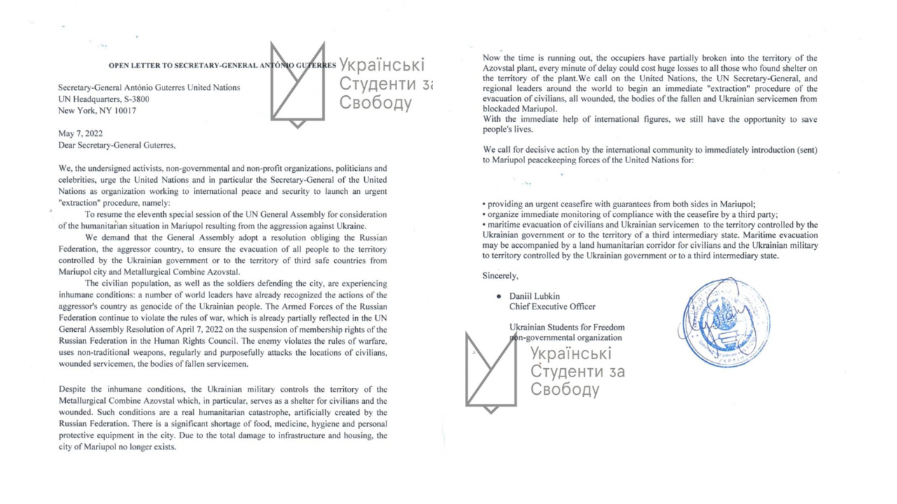 📄 «Українські Студенти за Свободу» долучились до підписання колективного листа-звернення до ООН щодо порятунку українських військових з Азовсталі