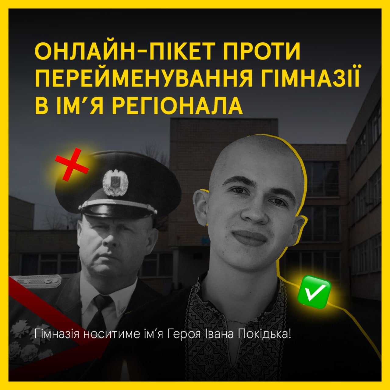 Акції та протести під час воєнного стану заборонені, але онлайн-пікет заборонити нам не зможуть. Наступні декілька днів ми долучаємось до онлайн-пікету проти перейменування гімназії ім'ям О. Голякова і зібраємо 1000 голосів на петиції, зареєстрованій на сайті ради.