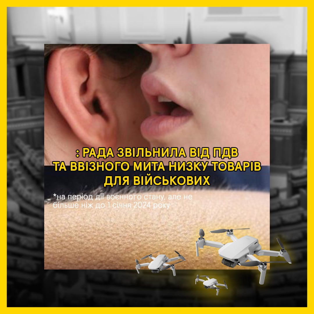 Учора Верховна Рада ухвалила два законопроєкти (№8360 та №8361-д), які звільняють від ПДВ та ввізного мита товари, які мають дуже важливе значення у війні з росією. Серед таких товарів: безпілотники, приціли, тепловізійні біноклі, прилади нічного бачення, засоби супутникового зв’язку і тактичної медицини. На прохання волонтерів до цього списку додали і рації. Нововведені пільги діятимуть до кінця воєнного стану, але не довше, ніж до 1 січня 2024 року.