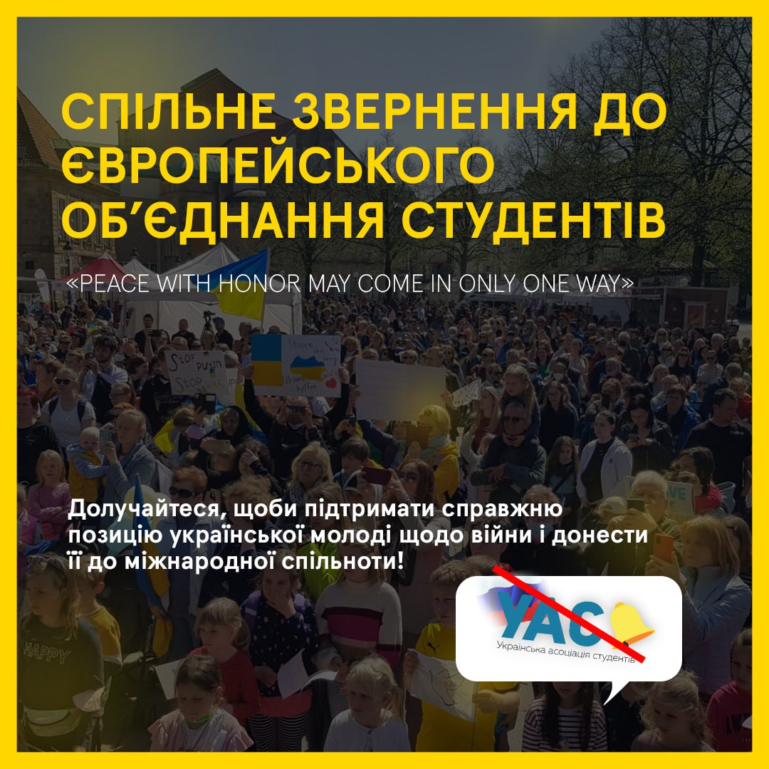 Закликаємо очільників студентських самоврядувань, молодіжних і громадських організацій — ініціатив, які є юридичними особами — доєднатися до підпису резолюції, яка більш репрезентативно окреслить позицію української молоді щодо війни! Наша резолюція є реакцією на висловлювання та дії УАС як єдиного представника України в ESU, які абсолютно суперечать актуальній позиції молоді.