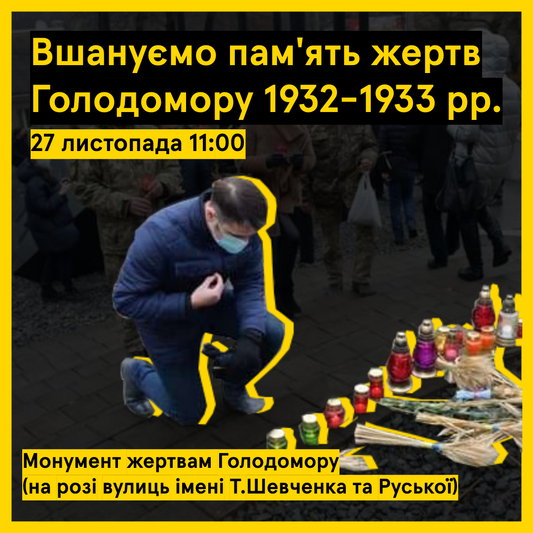 27 листопада об 11:00 на розі вулиць імені Т.Шевченка та Руської біля монументу жертвам Голодомору відбудуться скорботні заходи. Окрім цього відбудеться всеукраїнська акція «Запали свічку».
