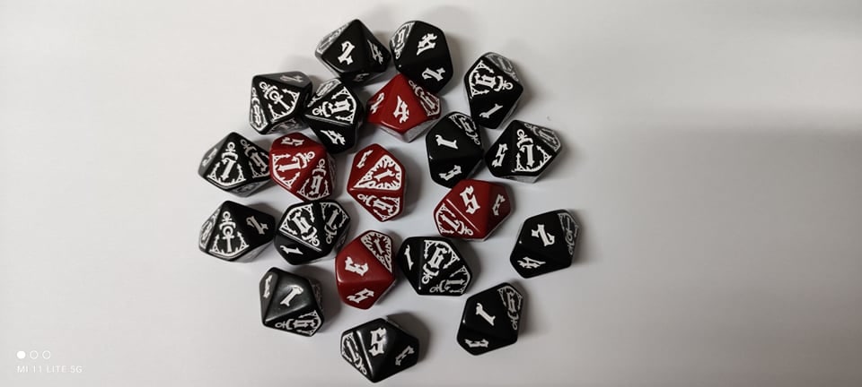 В комплект входит 20 игральных костей (d10) с оригинальным дизайном от Q-Workshop: 15 чёрных (для обычных проверок) и 5 красных (для пула Голода). Дизайн и тираж созданы Q-Workshop специально для российского издания игры.
