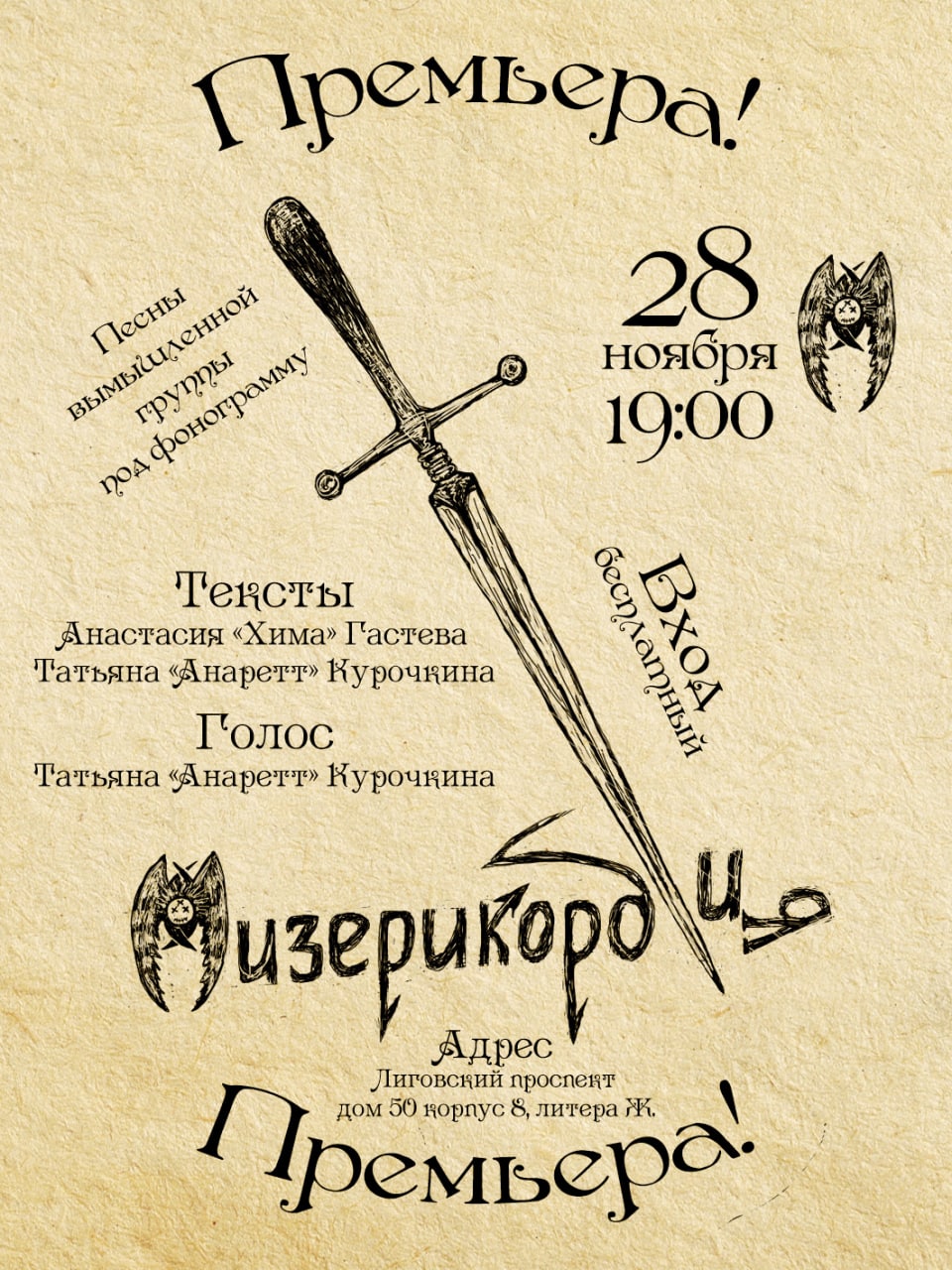 Все, кто посетит эту встречу, смогут вживую послушать песни вымышленной группы «Мизерикордия», задать любые вопросы Химе и Анаретт (и, возможно, даже получить ответы), а также насладиться отличной компанией, согревающим чаем и различными лакомствами. Ждём вас на празднике!