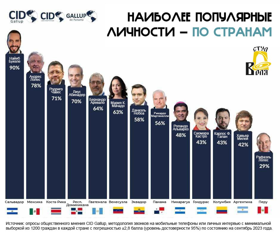 Международный аналитический институт Гэллапа (Gallup) на днях опубликовал рейтинг лидеров общественного мнения в Латинской Америке. Кросс-страновое исследование проводилось посредством телефонных и личных интервью.