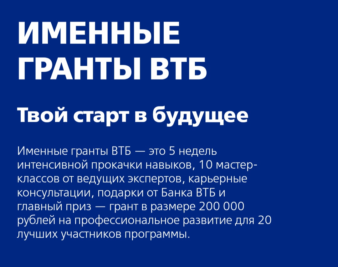 Именные гранты ВТБ – это пять недель интенсивной прокачки soft и hard skills, 10 мастер-классов от ведущих спикеров, подарки и главный приз — грант в размере 200 000 рублей на профессиональное развитие для 20 лучших участников.